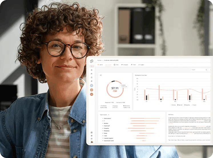 - Integrierte Kundenerfahrung im gesamten System: Feedback wird auf einer Plattform erfasst und analysiert, die für einen nahtlosen Zugriff in interne, bestehende Systeme integriert ist.