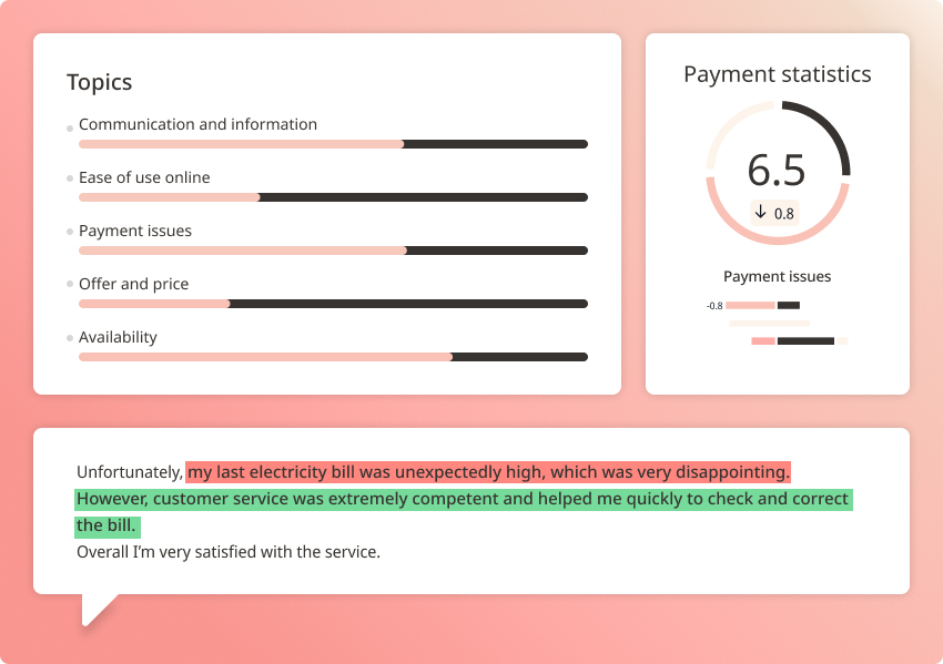 Identify positive and negative trends in feedback data and track them over time. Get summaries from thousands of data from different channels (such as comparison websites) and touchpoints for a holistic view.