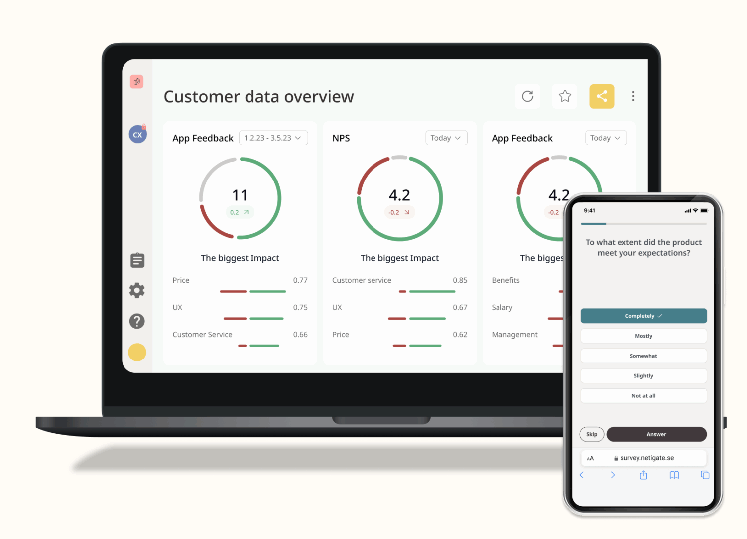 - Connect your insights with your key performance indicators. Compare data to uncover weaknesses and optimize the CX holistically.