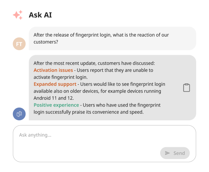 Ask AI gör upplevelsedata enkel att förstå och använda. Med AI-stödd analys kan organisationer snabbt omvandla stora mängder feedback och supportdata till tydliga svar som stödjer snabbare och mer välgrundade beslut.